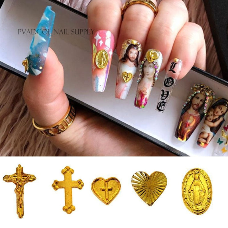 Cherub Nails Jesus Heart Cross Shape 3D Metal Nail Art Alloy Charms Gold Plated Salon Tips Manicure Decoration
