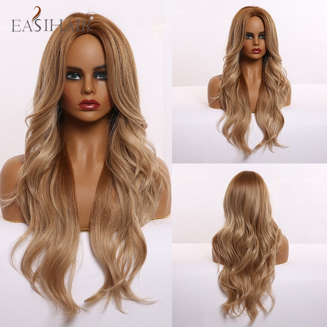 EASIHAIR Ombre Brown Light Blonde Platinum Long Wavy Middle Part Hair Wig Cosplay Natural Heat Resistant Synthetic Wig for Women