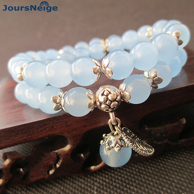 JoursNeige Blue Crystal Bracelets 8mm Round Bead Lucky Tibetan Silver Leaf Pendant Bracelet for Women Crystal Multilayer Jewelry