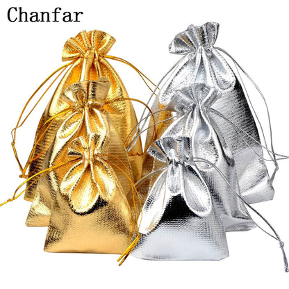 50pcs/lot 7x9 9x12 10x15cm Adjustable Jewelry Packing Fabric Bag Gold Colors Drawstring Wedding Storage Pouches