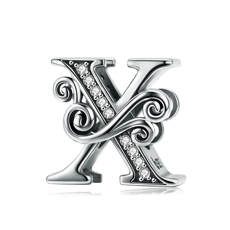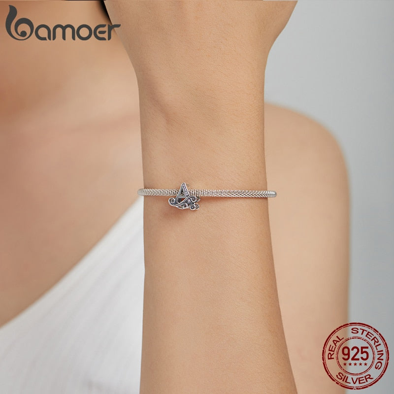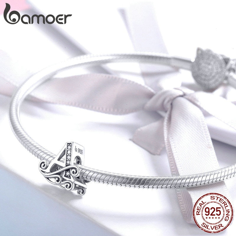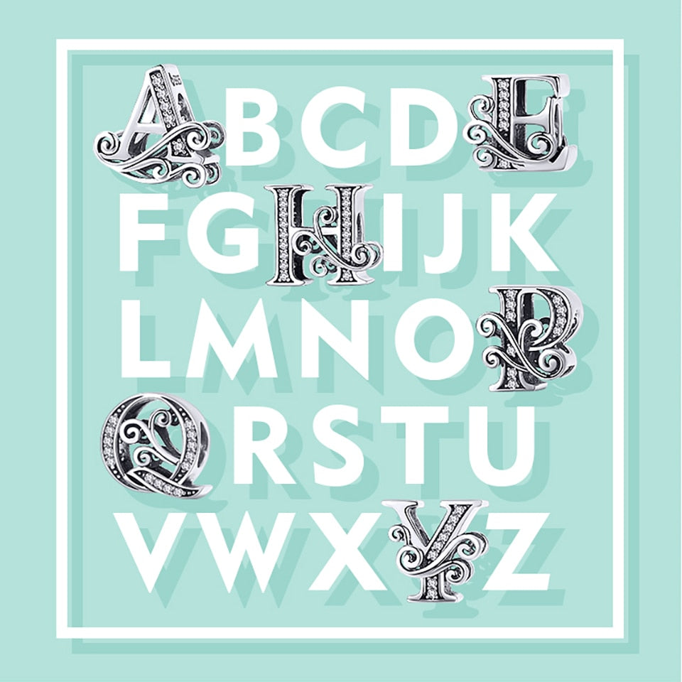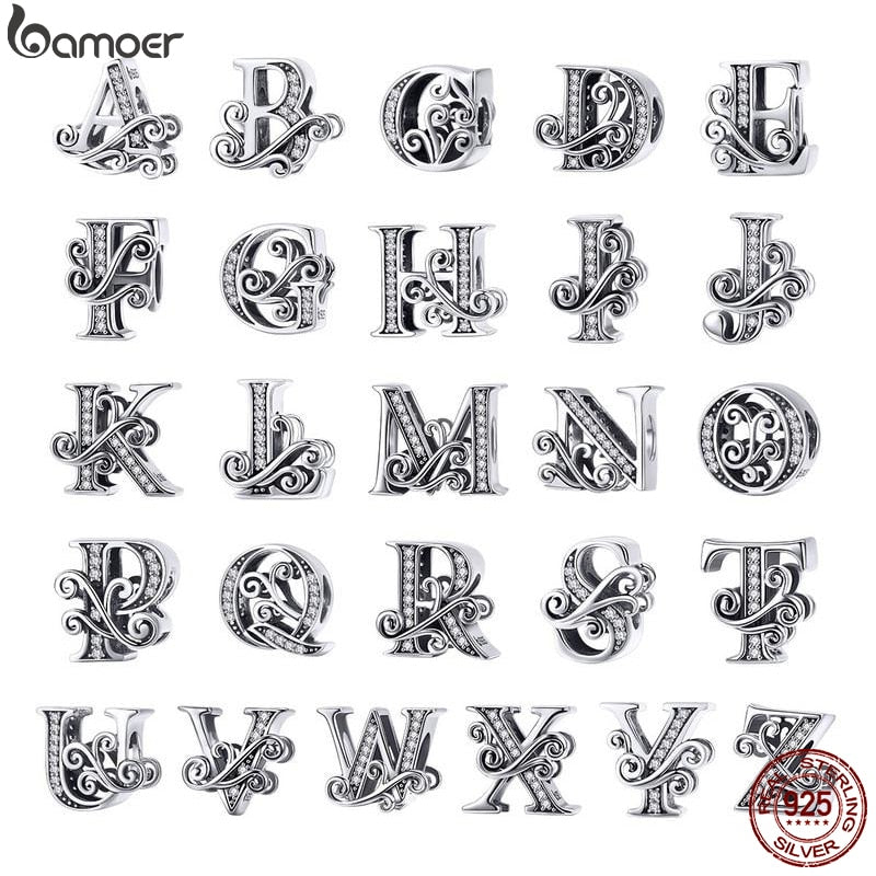 BAMOER 925 Sterling Silver Letter Vintage A to Z 26 Letter Charms Openwork CZ Alphabet Beads Fit Charm Bracelet BSC030